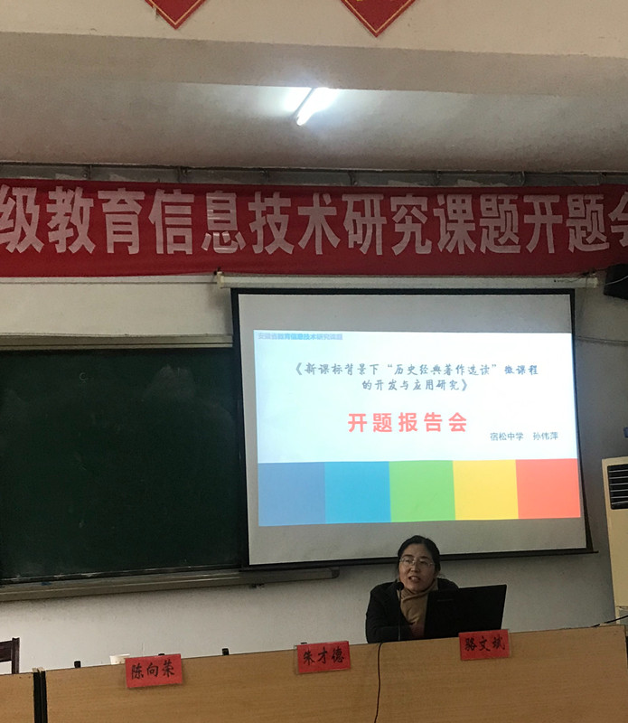 12月16日下午,宿松中學孫偉萍工作室申報立項的省級教育信息技術研究課題《新課標背景下“歷史經典著作選讀”微課程的開發與應用研究》如期開題。開題報告會在城關初中召開,宿松中學課題組在分管校長胡為群、教研主任王金旺的帶領下參加會議;課題負責人孫偉萍做開題報告。