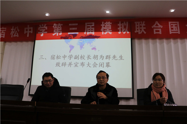 天下沒有不散的筵席。在12.31日下午4時許舉行的大會閉幕式上,大會副秘書長夏之秋對大會進行了總結。各委員會主席為優秀代表頒發了獲獎證書。副校長胡為群、校團委余展鵬老師等出席了大會閉幕式,胡校長在致辭中代表向以各種形式促進本次大會順利召開的各界人士表達了感謝,同時對宿中模聯社團表達了美好的祝愿。最后,胡校長宣布大會閉幕,本次大會圓滿結束。
