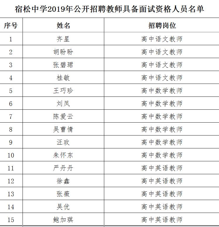 根據《安徽省宿松中學2019年公開招聘教師面試方案》要求,經現場資格審查,現將具備面試資格人員名單公布如下。面試時間與地點另行通知。