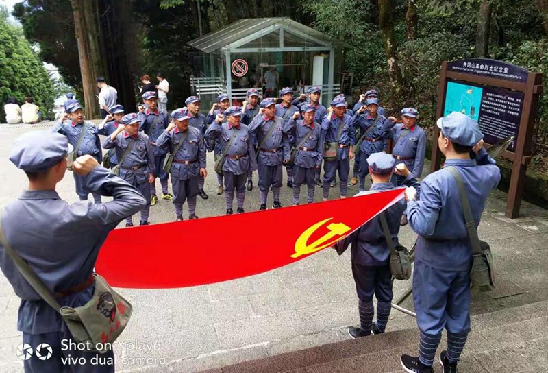 黨員干部一到井岡山,就換上紅軍服,佩戴好黨徽,頂著酷暑,冒著烈日,迅速開展系列學習活動。活動從重溫入黨誓詞開始,在群山環繞、松柏蒼翠的革命烈士紀念館前,全體黨員干部莊嚴地舉起右手,在總支部書記的帶領下重溫了入黨誓詞,銘記了共產黨員的初心。