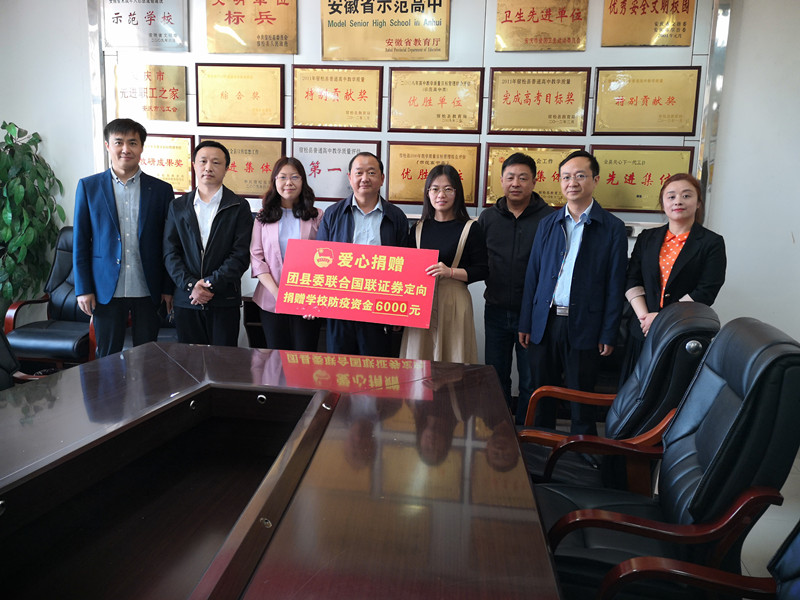大愛無疆,共抗疫情。4月27號,團縣委聯合國聯證券向宿松中學捐贈愛心防疫資金6000元,團縣委副書記余玲、掛職副書記朱彤、縣教育局團工委書記梅耐冰出席捐贈儀式。宿松中學將會把這筆資金用于學校防疫的相關工作,專款專用,為學生創造一個安全優良的學習環境,讓家長和社會放心。(校團委)