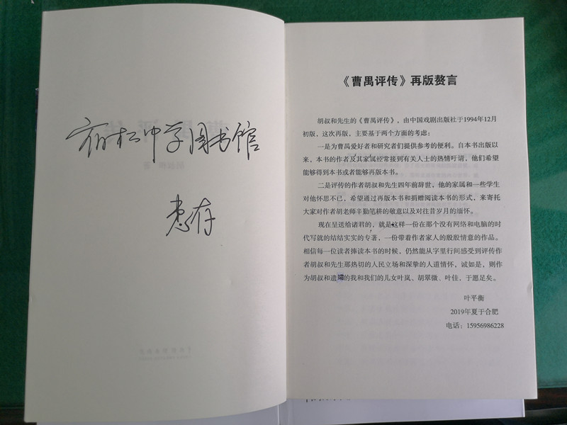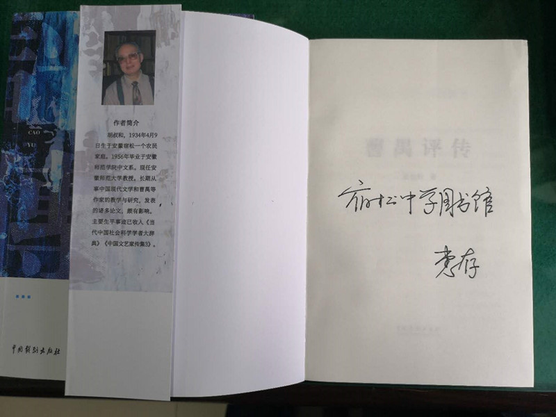 7月16日,宿松中學獲贈已故宿松籍安徽師范大學中文系知名教授胡叔和先生專著《曹禺評傳》。該書近期由作者遺孀安徽師范大學中文系教授葉平衡女士授權再版。懷著對家鄉的殷殷情意,葉教授專門將其中部分圖書贈送給宿松中學圖書館收藏。