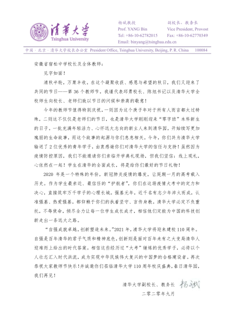 清秋半輪,萬粟豐收。在這個凝聚收獲、感恩與希望的秋日,我們又迎來了共同的節日——第 36 個教師節。我謹代表邱勇校長、陳旭書記以及清華大學全