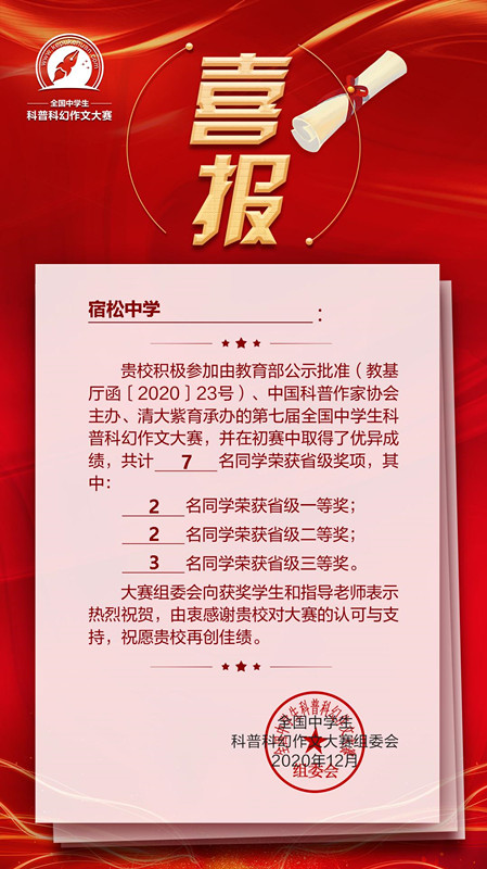 我校學生參加第七屆全國中學生科普科幻作文榮獲佳績