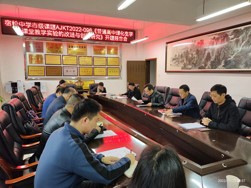 11月22日,宿松縣教育局朱才德主任、楊程鵬主任、歐陽明主任一行,蒞臨我校舉行宿松中學(xué)2022年市級課題開題報告會,對宿松中學(xué)的兩個市規(guī)劃課題《普通高中理化生學(xué)科課堂教學(xué)實驗的改進(jìn)與創(chuàng)新研究》、《核心素養(yǎng)導(dǎo)向下高中化學(xué)新教材實驗創(chuàng)新研究》進(jìn)行了現(xiàn)場開題論證。胡為群校長、張松林副校長、王金旺主任、朱學(xué)文主任及課題組相關(guān)人員參加了會議。