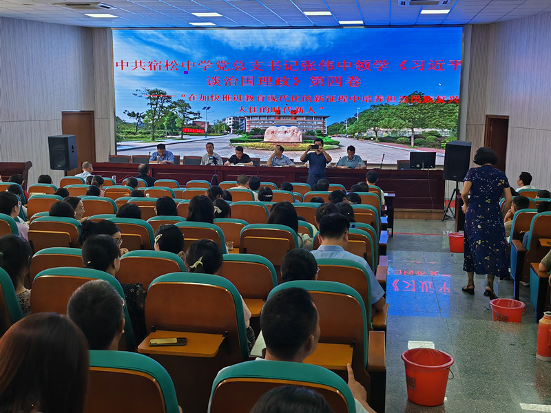 9月30日下午,宿松中學全體教職工在校圖書館報告廳深入學習了《習近平談治國理政》第四卷,中共宿松中學黨總支書記張偉中領學。