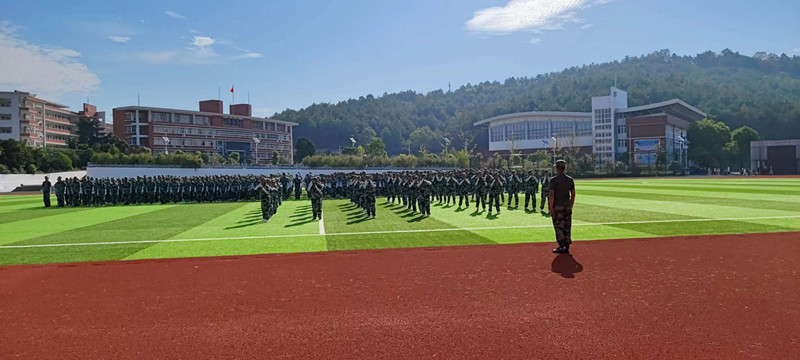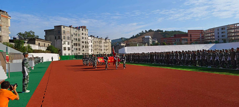 在莊嚴的國歌聲中,五星紅旗冉冉升起,高一新生軍訓匯演拉開序幕。伴隨著雄壯的進行曲,2022級新生身穿迷彩服,邁著整齊的步伐,高喊響亮的口號踏入綠茵場。隨后,新生們表演了女子格斗拳、男子擒敵拳、心理健康減壓操等。同學們隊列整齊,步伐一致,口號嘹亮,身姿標準,精神飽滿,意氣風發,斗志昂揚,展現了新生們朝氣蓬勃的青春風采和精神面貌,博得領導和師生們的熱烈掌聲。