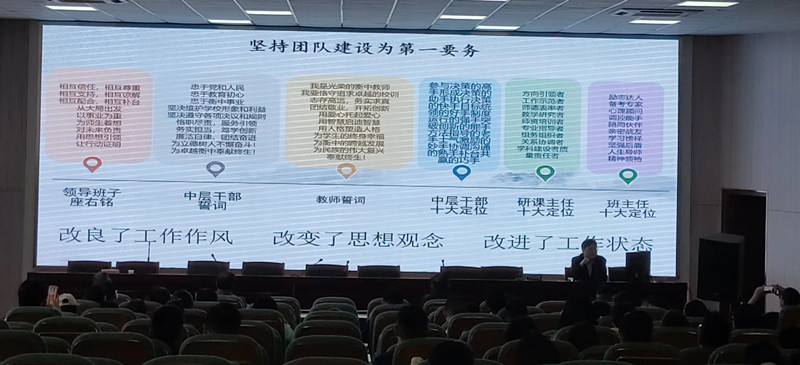 在長達三個半小時的報告會上,杜文星結合衡水中學的育人理念、教學管理、規章制度、日常養成、成功經驗,分別從提高教師的精氣神、提高教學質量的方法、拔尖人才培養策略和路徑三個方面對我校老師進行了詳細而專業的講解。報告內容新穎而實用,既有高屋建瓴的理論,又有生動有力的例證。與會教師如沐春風,醍醐灌頂,反響強烈。報告會結束時,老師們對杜文星報以熱烈的掌聲。