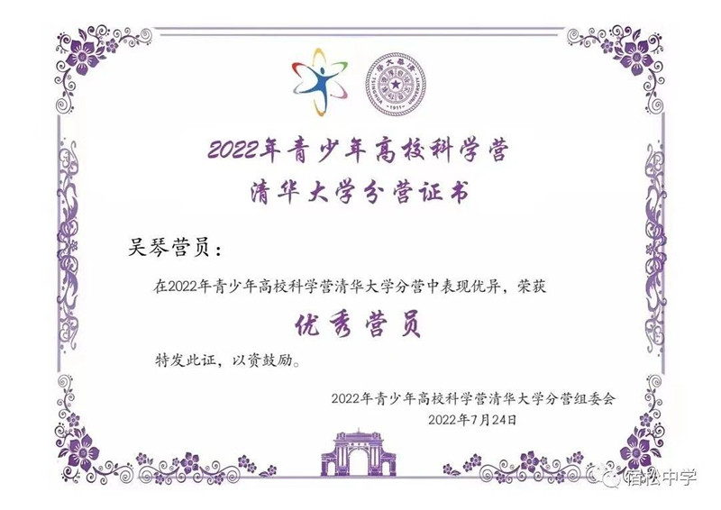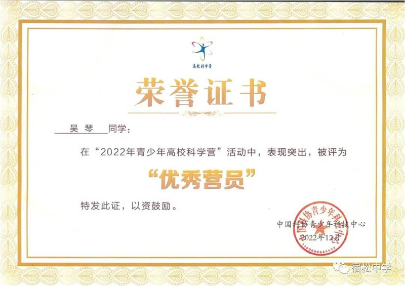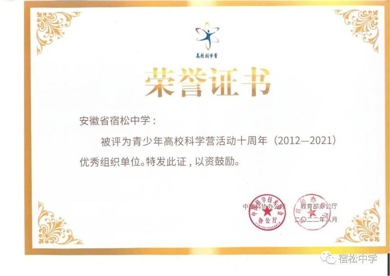 近日,宿松中學被中國科協、教育部授予“青少年高校科學營活動十周年(2012-2021)優秀組織單位”榮譽證書。2022年青少年高校科學營,安徽省32個營隊共招募了320名學生營員參與32所高校科學營分營及專題營活動。在清華大學分營中,宿松中學高二(20)班吳琴同學表現優異、成績突出,被評為“清華大學分營優秀營員”和“全國優秀營員”。