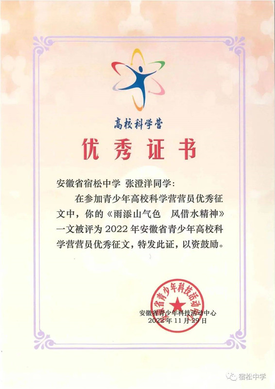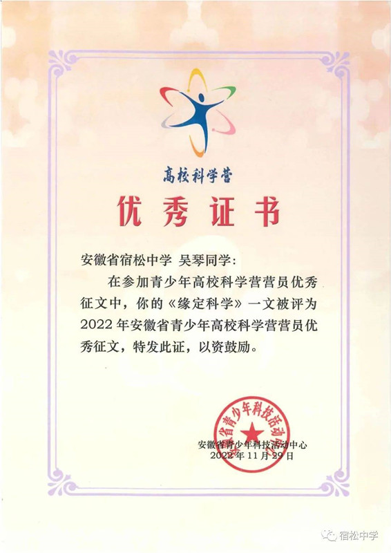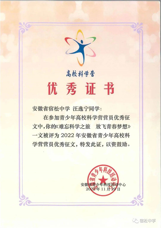 在營期內開展的“我與科學營”征文活動中,全省共評出優秀征文26篇,宿松中學高二(21)班張澄洋、高二(21)班汪逸寧、高二(20)班吳琴三名同學喜獲“2022年安徽省青少年高校科學營營員優秀征文”優秀證書。