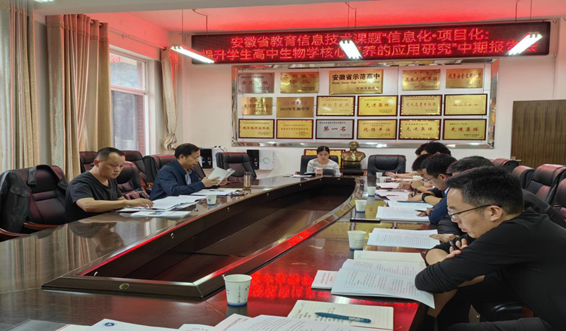 2024年10月14日下午,安徽省教育信息技術課題《信息化·項目化:提升學生高中生物學核心素養(yǎng)的應用研究》(立項號:AH2023153)中期報告會在宿松中學辦公樓四樓會議室舉行。宿松縣教育局教研室主任周少華、宿松縣教育局電教儀器站站長駱文斌蒞臨指導。宿松中學副校長張松林、教研處主任王金旺及課題組全體成員參加了本次會議,會議由張松林主持。