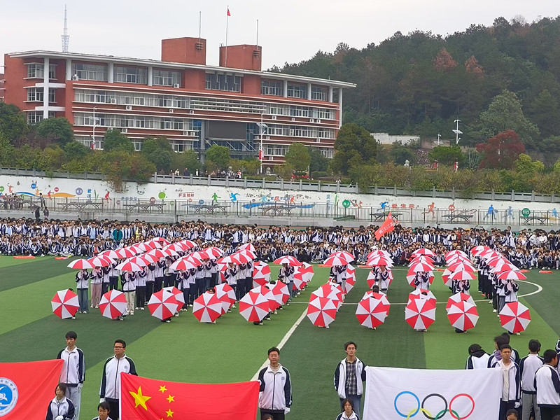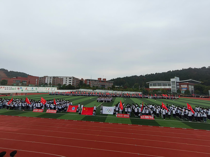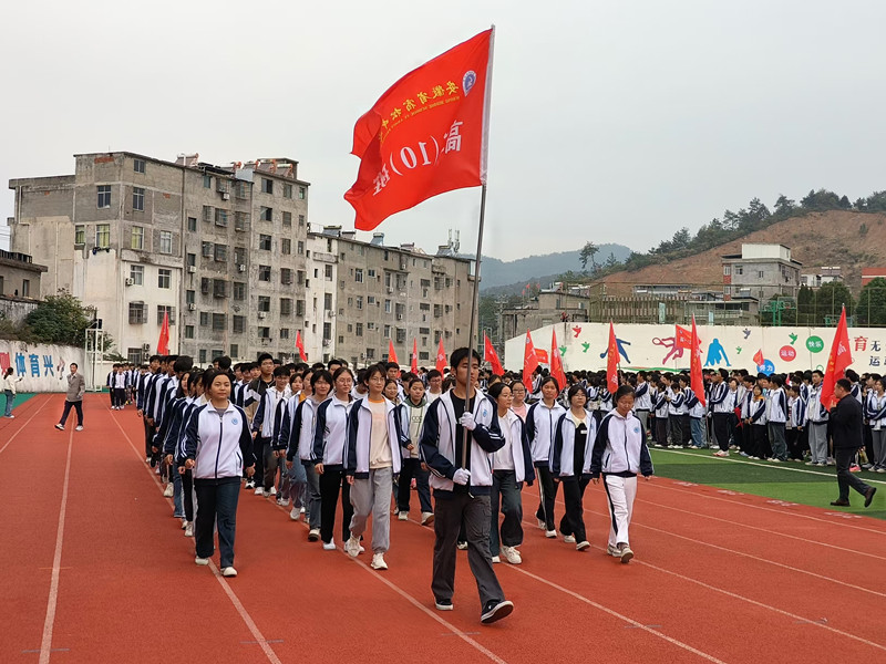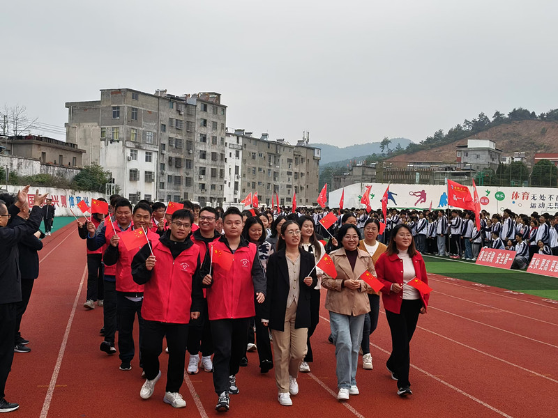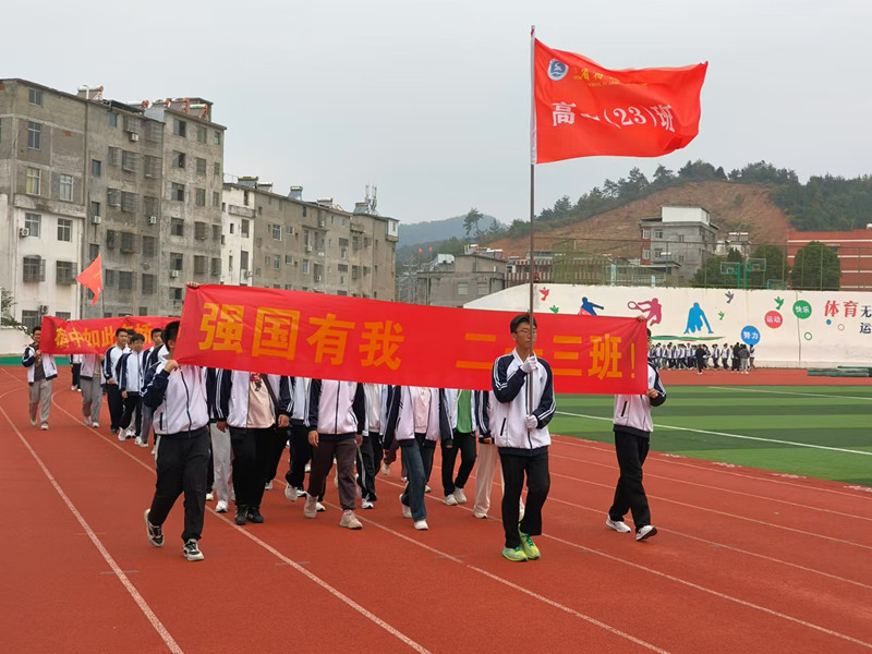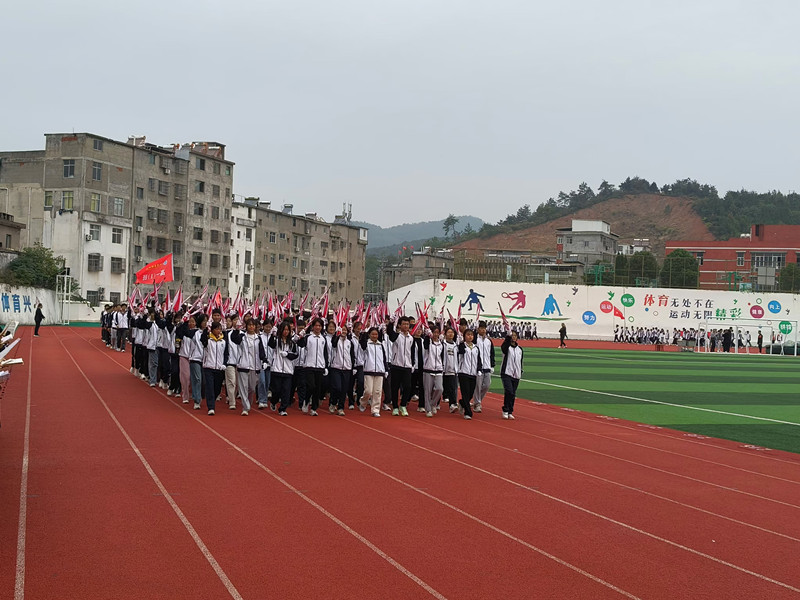 上午八時,入場式正式開始。激昂的《運動員進行曲》奏響,國旗方陣莊重威嚴,校旗方陣朝氣蓬勃,奧林匹克五環旗方陣彰顯著體育精神。隨后宣傳標語方陣、表演方陣、各班代表隊和黨員志愿者方陣依次入場,他們步伐整齊,口號嘹亮。