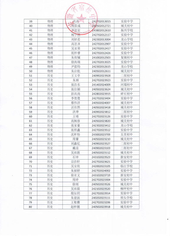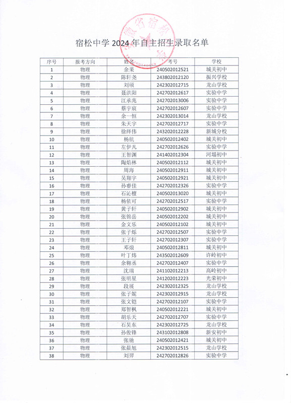 宿松中學2024年自主招生錄取名單