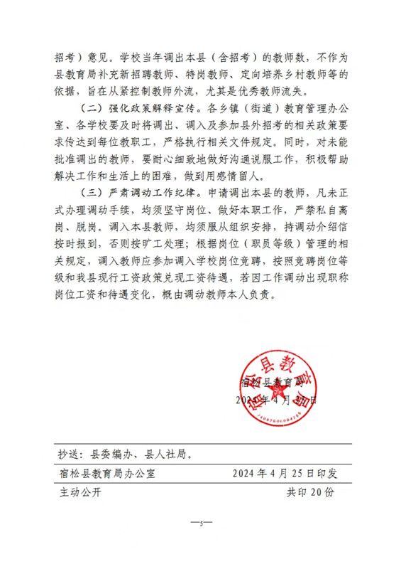 目前,宿松縣教育局進一步規范了中小學教師進出本縣的管理工作。對于符合條件調入的教師,將按照相關程序進行辦理。我們期待著您的回歸,共同為家鄉的孩子們提供更優質的教育,為他們的未來奠定堅實的基礎。