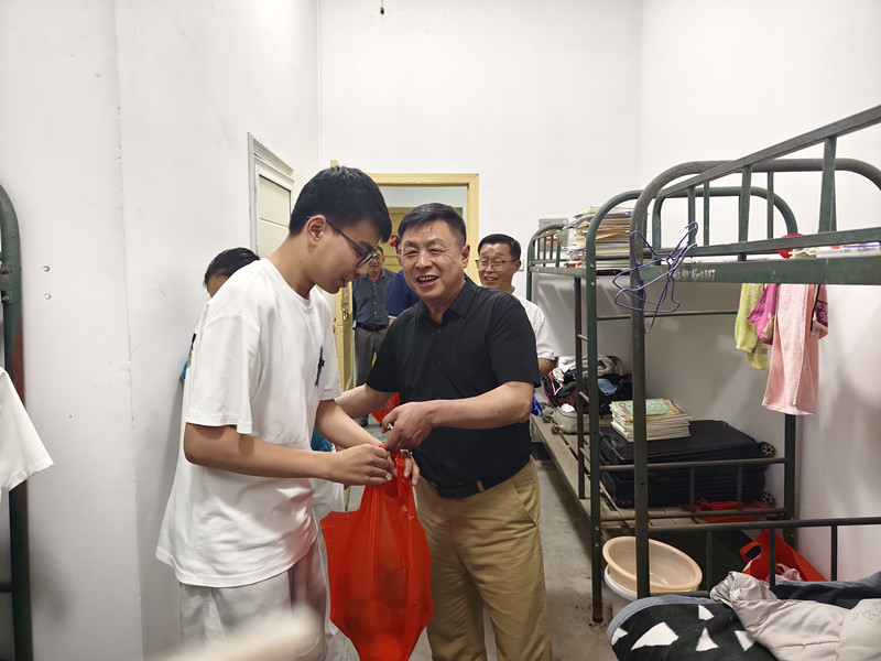 6月6日,高考前夜,宿松中學(xué)黨總支書記張偉中、校長唐仁兵等校領(lǐng)導(dǎo)來到學(xué)生宿舍,親切慰問住校備考的高三學(xué)子,為他們送上溫暖關(guān)懷與殷切鼓勵。