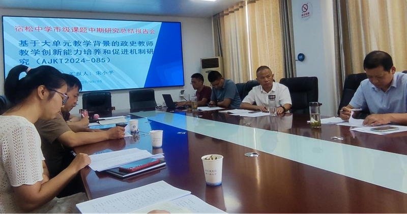 9月5日,宿松中學市級課題《基于大單元教學背景的政史教師教學創新能力培養和促進機制研究》中期研究總結報告會順利舉行。會議由課題負責人朱小平老師主持,宿松縣教育局教研室領導歐陽明、朱旭南,宿松中學副校長張松林、教研副主任楊林盛以及課題組全體成員出席。
